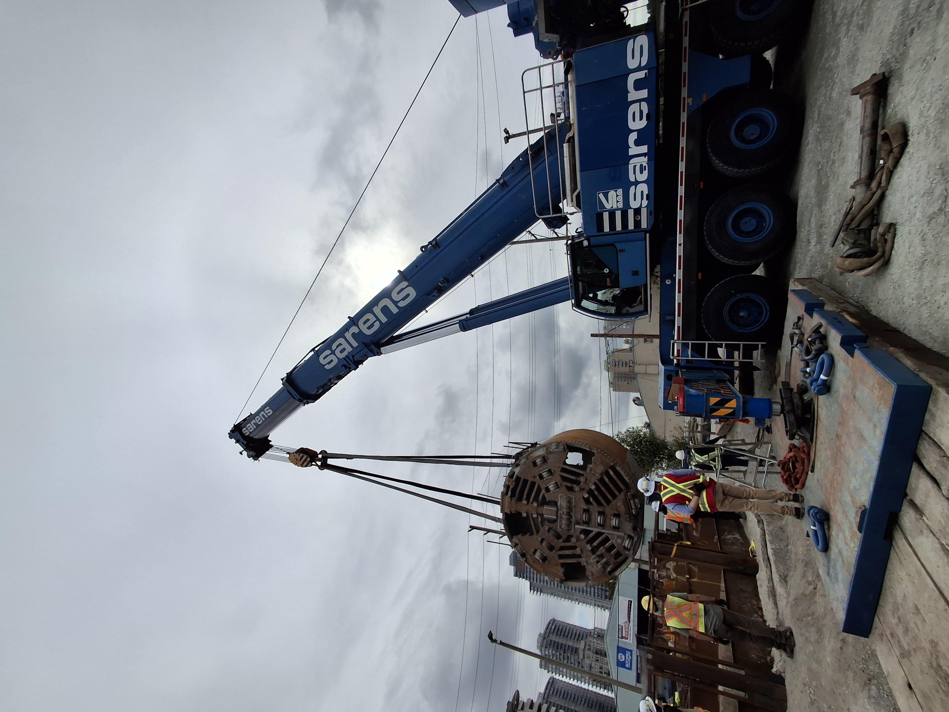 The removal of the TBM cutting head, weighing approximately 250,000 lbs, was carried out at a radius of around 25 feet using an LTM 1400 crane unit (main boom only) in a complex environment due to the proximity of traffic.