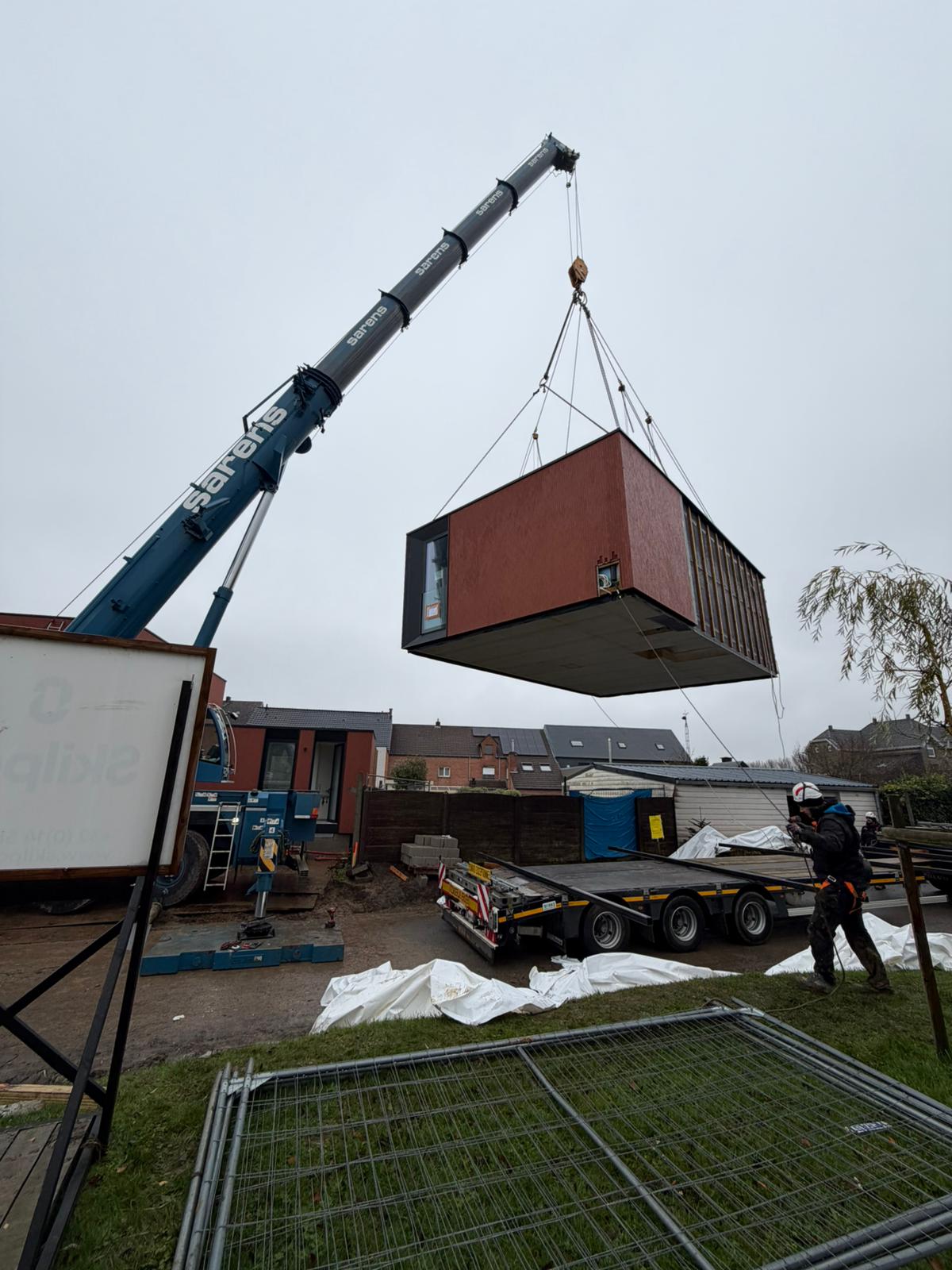 Transport was een van de meest significante uitdagingen, aangezien de modules 135 kilometer over smalle wegen moesten afleggen, waardoor de operatie over twee nachten moest worden uitgevoerd met behulp van twee diepladers, een extra oplegger en een team bestaande uit 2 chauffeurs, 6 escortepiloten, evenals kraanteams en ondersteunend personeel ter plaatse. Dit was nog maar het tweede transport van dit type in België, wat de complexiteit van het project benadrukt. De logistiek werd ook beperkt door smalle straten, de noodzaak om wegen af te sluiten, parkeerverboden in te stellen en te manoeuvreren rond boomrijke gebieden. De kraan van Sarens bleef twee dagen ter plaatse voor het laden en lossen van de modules, en ondanks de uitdagingen werd de operatie met succes voltooid, wat de positie van Sarens als een strategische partner in de installatie van modulaire woningen versterkt en een mijlpaal markeert in de voortdurende samenwerking met Skilpod, vooral gezien de uitzonderlijke grootte van de modules in dit project.