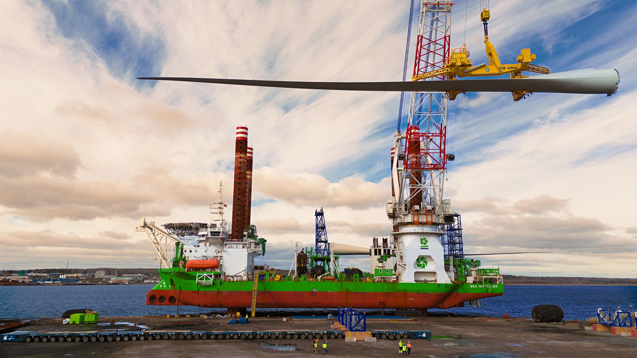 Sarens, world leader in heavy lifting, engineered transport, and crane rental services, identified this opportunity early on. Sarens worked directly with the port owner to adapt Atlantic Canada Bulk Terminal to industry requirements. This specifically involved ensuring the quayside could facilitate safe operations for the loading and unloading of wind turbine blades and massive offshore foundation piles, some of these components exceeding 1,900 tonnes in weight and 100 meters in length each.